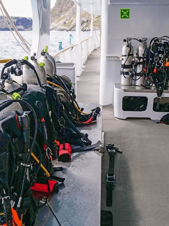 - 12L tanks for air, weights, belts, scuba safety equipment (personal marine rescue GPS), and towels.