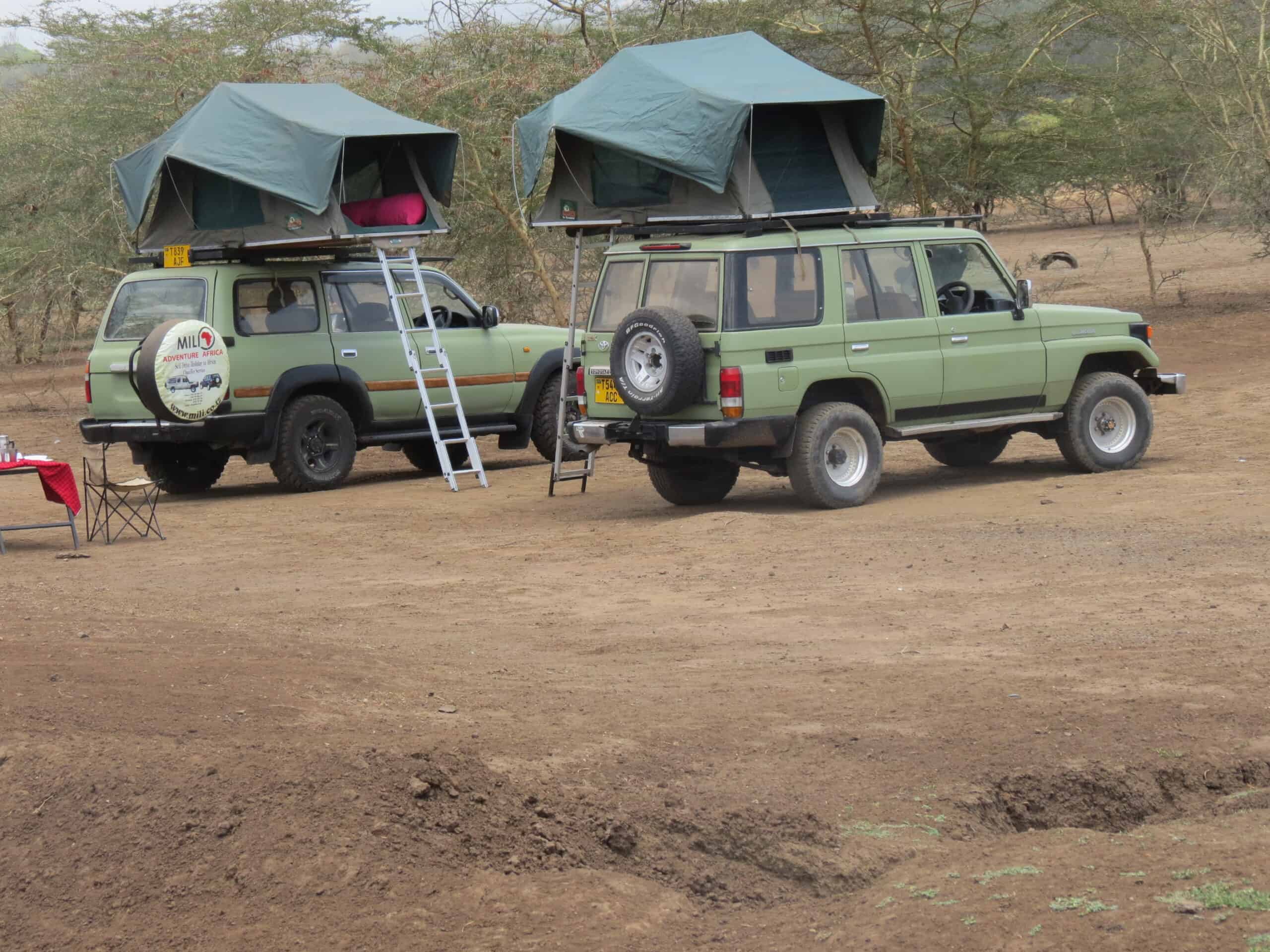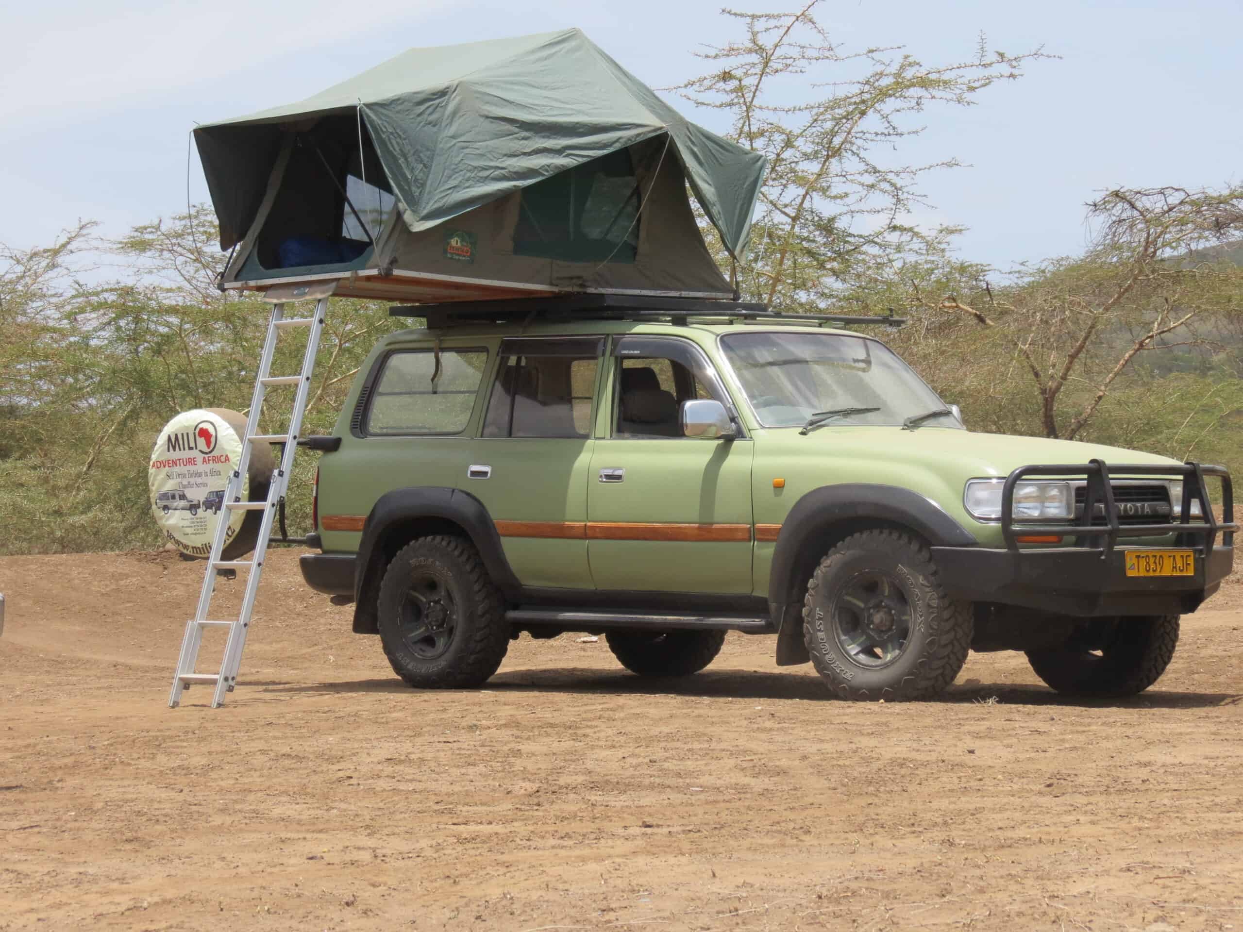 - Car hire for a self-drive trip: Mili Adventure Africa maintains several 4×4 fleets for self-drive. From Toyota Land Cruiser 4-seaters. The Land Cruiser can be equipped with a rooftop tent, camping equipment, an electric fridge, camping chairs, or a ground tent on request for camping trips.